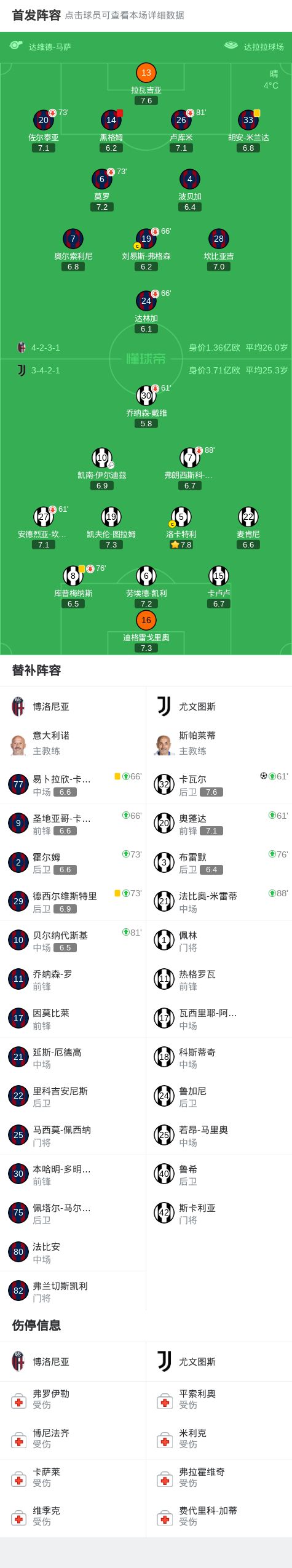 北京时间12月15日,意大利足球顶级联赛第15轮,博洛尼亚坐镇主场迎战尤文图斯。上半场,戴维破门,但是因麦肯尼越位在先被吹无效。下半场,伊尔迪兹助攻,卡瓦尔打破僵局。随后,奥蓬达单刀被黑格姆放倒,后者被直红罚下。全场比赛结束,尤文客场1-0击败博洛尼亚。